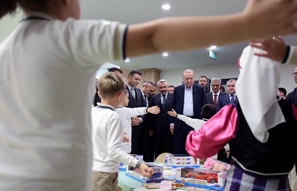 Cumhurbaşkanı Erdoğan, kendisini karşılayan çocuklarla sohbet ederek hediye verdi.