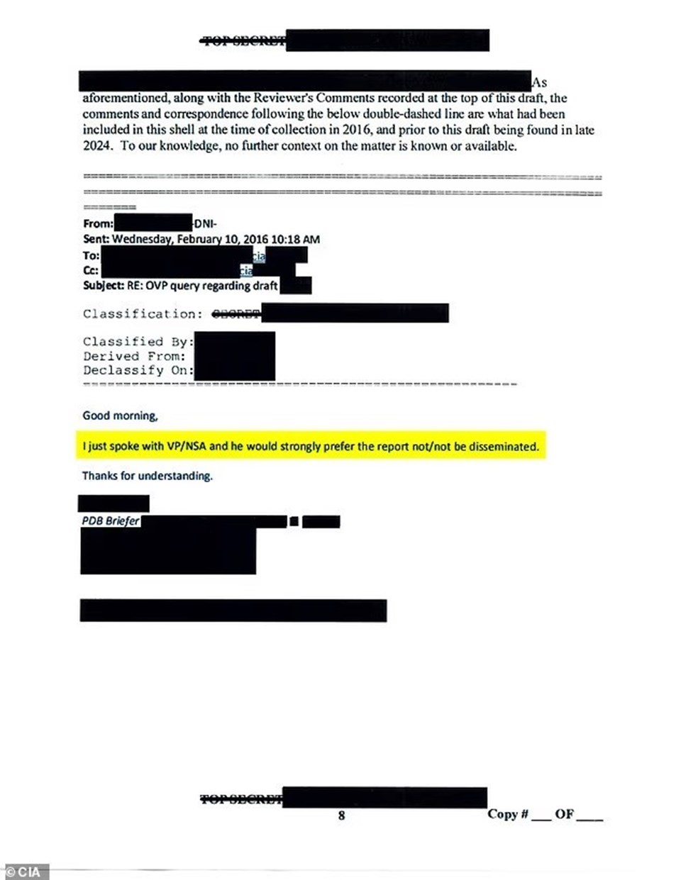 CIA tarafından gizliliği kaldırılan belgede sarı işaretli kısımda, “Az önce Başkan Yardımcısı/Ulusal Güvenlik Danışmanı ile konuştum ve raporun kesinlikle yayımlanmamasını güçlü bir şekilde tercih ettiğini belirtti” notu yer alıyor.