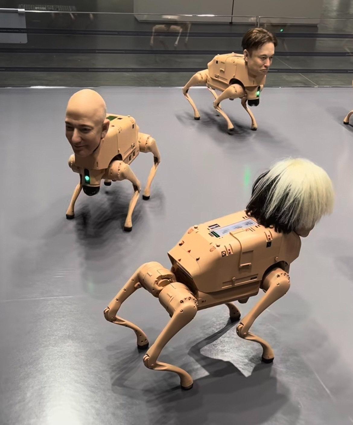 ABD’deki bir fuarda Elon Musk, Jeff Bezos, Mark Zuckerberg, Pablo Picasso ve Andy Warhol’un maskelerini taşıyan otonom robot köpekler büyük ilgi topladı.