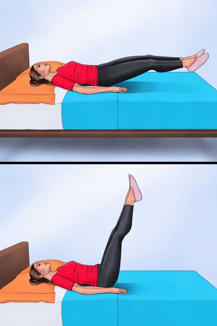 Sırt üstü yatarak bacaklarınızı düz tutun. Kollarınızı yanlara açarak sabitleyin. Bacağınızı yukarı kaldırıp sonra düz bir şekilde aşağı indirin. Bu pozisyonda kalarak hareketi diğer bacak için de tekrarlayın.